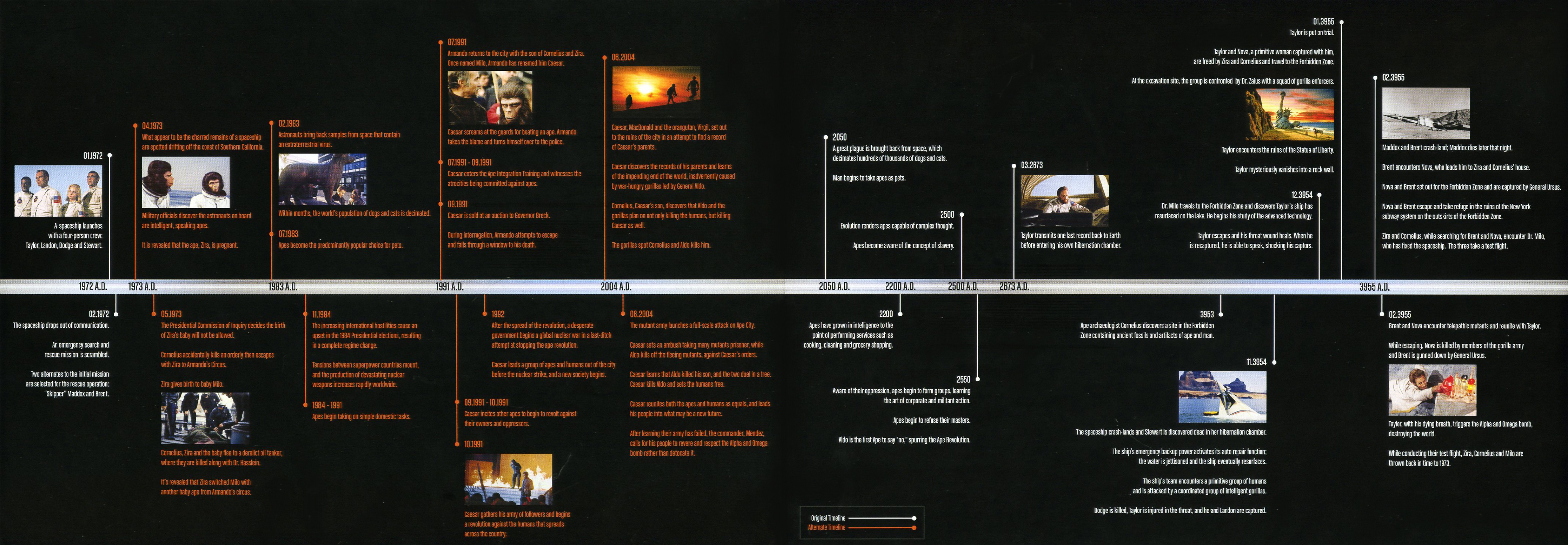 However, the 2008 release of the collected Planet of the Apes films included a strange timeline in which the paradox is addressed by means of a rewriting of history, as seem in this diagram. The initial sequence of events would be the one written in white, and Zira and Cornelius's trip to 1973 changed history into the events written in red, which imply that posterior events in white no longer take place and that the world is never destroyed, but apes and humans live happily (sort of) together ever after.